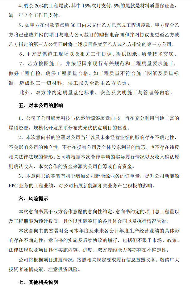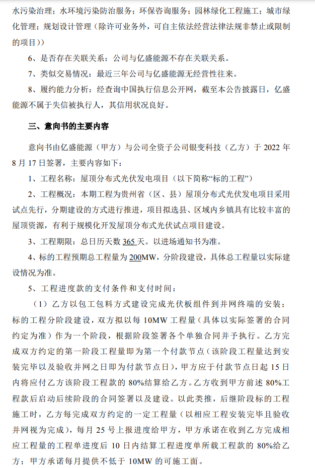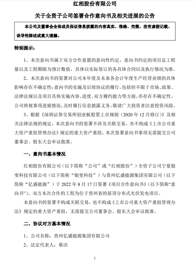 【國際能源網 訊】8月18日,紅相股份發布公告稱,公司全資子公司寧夏銀變科技有限公司與貴州億盛能源集團有限公司于2022年8月17日簽署《項目合作意向書》。雙方本次合作的工程為位于貴州省的屋頂分布式光伏發電項目,預期總工程量為200MW。