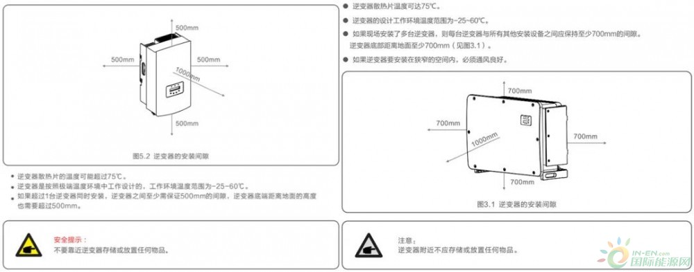 多臺逆變器安裝時,安裝距離也非常重要,這決定了逆變器散熱性能和風扇工作效率。若距離較小,風扇工作頻率增加,且散熱也不理想,則會導致系統(tǒng)發(fā)電量受影響。不同逆變器安裝距離不同,建議參考錦浪科技相應產品說明書:
