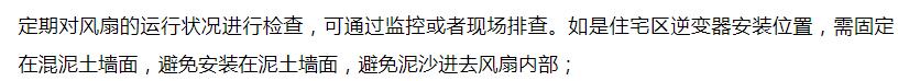 要保障逆變器散熱風扇正常運行,前期合理的安裝和后期排查運維必不可少,首先需要避免有異物積累的安裝環(huán)境或者添加保護機制,并定期通過監(jiān)控和現場排查及時清理和更換風扇,以保障逆變器正常運行。