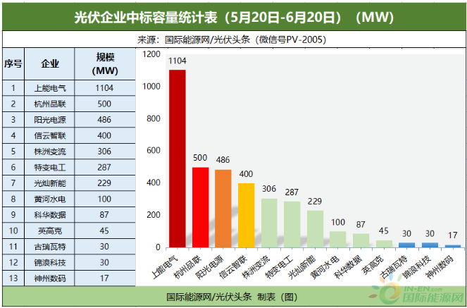 其中,上能電氣中標1104MW,排名第一,杭州品聯500MW排名第二,陽光電源486MW列第三名。