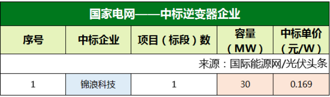 本統計周期內,國家電網有1個逆變器采購項目定標,定標容量30MW,錦浪科技中標。