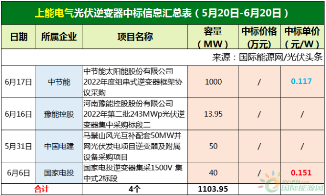 6月17日,中節能公示了1GW逆變器2022年度組串式逆變器框架協議采購候選人名單,上能電氣成為最大的贏家,獨享1GW采購份額。