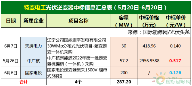 5月下旬以來,特變電工中標國家電投、中廣核、天擁電力等企業的3個項目(標段),合計容量287.2MW。