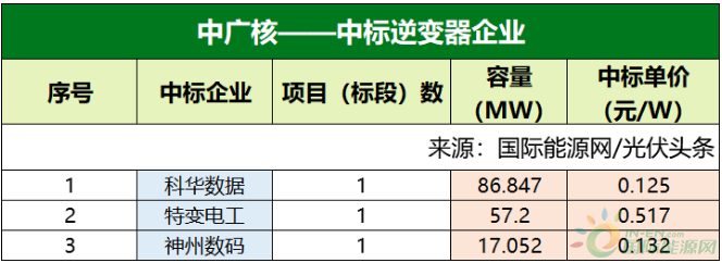中廣核有3個項目定標,合計容量161MW,科華數據、特變電工、神州數碼三家企業中標,具體情況如下: