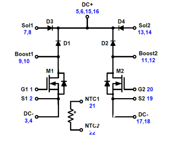 上圖為該全碳化硅功率模塊的內部電路拓撲,模塊內部由兩個相互獨立升壓級和一個熱敏電阻構成,其中MOSFET采用的是耐壓等級為1200V,導通電阻為40mΩ的碳化硅MOSFET。在各個升壓級處還包含了一個1200V/40A碳化硅升壓二極管,以及兩個1200V/50A的旁路整流器用于控制浪涌電流。在該電路中引入全碳化硅的功率器件,能夠使該集成模塊支持更高的開關頻率和更低的導通電阻,實現降低開關損耗,將電源轉換的能效實現最大化。同時更高的開關頻率有助于減小光伏逆變器的體積與設計成本。