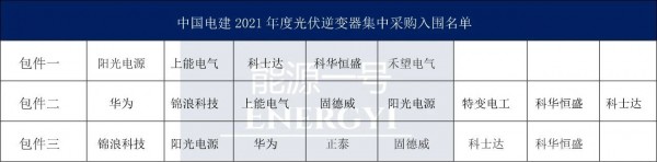 近日,中國電力建設股份有限公司(下稱“中電建”)公布了2021年度光伏逆變器集中采購項目入圍情況。入圍廠商總計有10家,分別列在不同的包件內。它們是華為、上能電氣、陽光電源、錦浪科技、固德威、特變電工等公司。