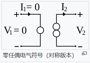 零任偶(nullor)是一種理想的二端口網絡,輸入端為零極子,輸出端為任意子,零任偶類似一個理想的放大器,其電壓增益、電流增益、跨導增益和跨阻抗(transimpedance)增益都是無限大。其傳輸參數都為0,也就是說,其輸入-輸出關系可以用以下的矩陣方程式表示。