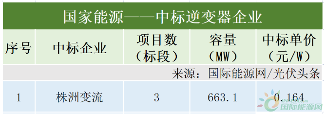 國家能源集團有3個項目(標段)定標,合計容量663.1MW。值得關注的是,株洲變流中標國家能源集團所有3個項目(標段),其中有一個項目披露了中標價格,單價為0.164元/W。