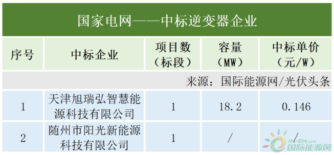 國家電網有2個項目定標,確定定標容量18.2MW。天津旭瑞弘智慧能源科技有限公司、隨州市陽光新能源科技有限公司為兩個項目的中標人。