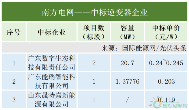 南方電網有4個項目定標,合計容量22.08MW。其中廣東數字生態科技有限責任公司中標2個項目,容量20.7MW,另外兩個項目的中標人為廣東能瑞智能科技有限公司以及山東晟特嘉新能源有限公司。