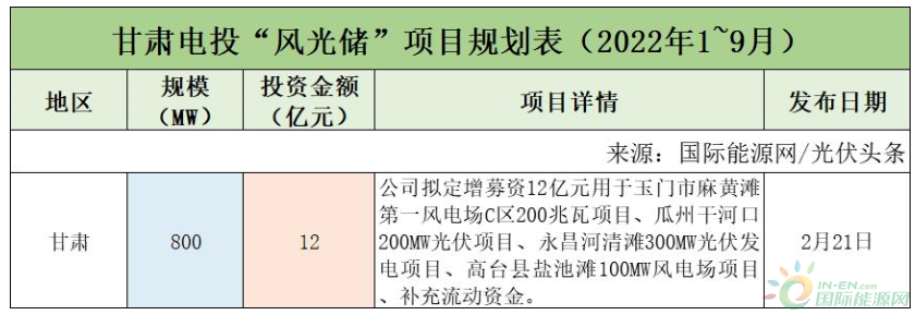 截至2022年9月30日,甘肅電投共規劃1個風光儲項目,項目規模為800MW,投資金額12億元。