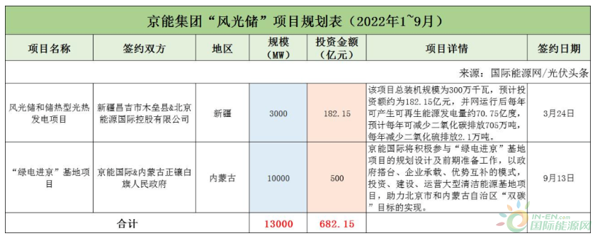 截至2022年9月30日,京能集團共簽約(規劃)2個風光儲項目,項目規模13GW,投資金額682.15億元。